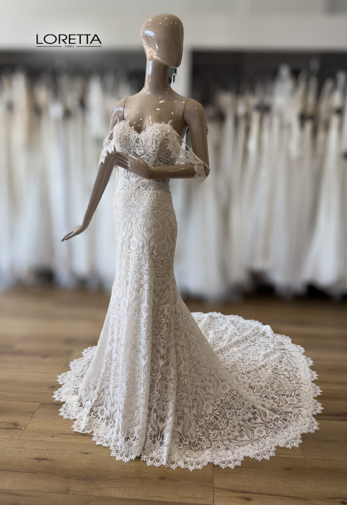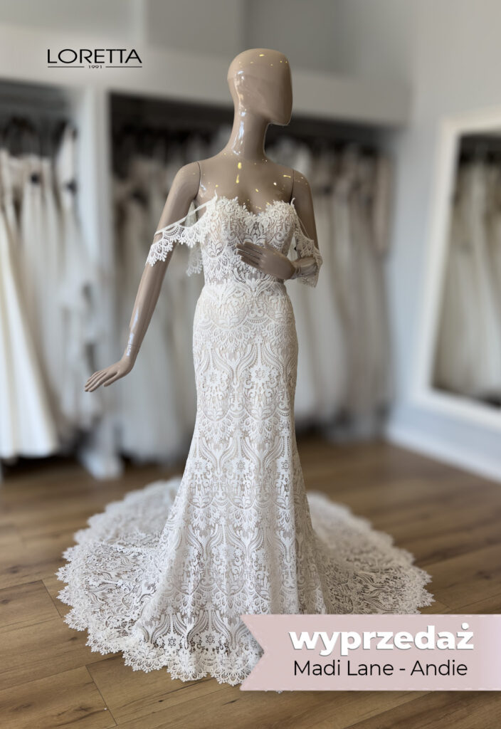 Wyjątkowa koronka Andie intryguje i hipnotyzuje – to suknia dla panny młodej, która ceni każdą chwilę spędzoną pod gwiazdami i celebrującą miłość.