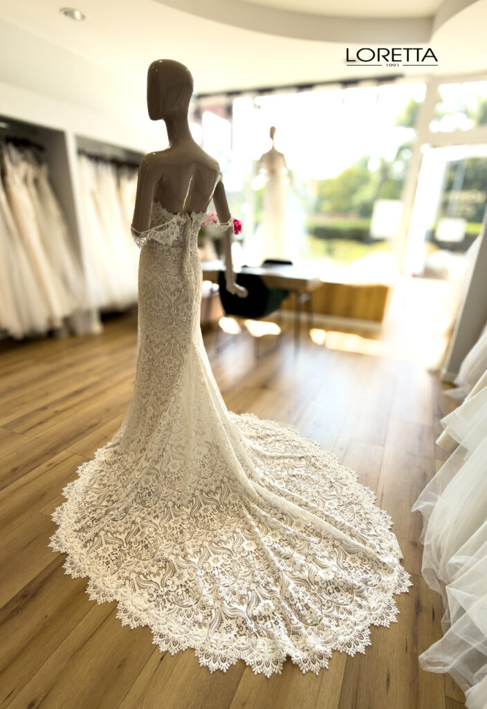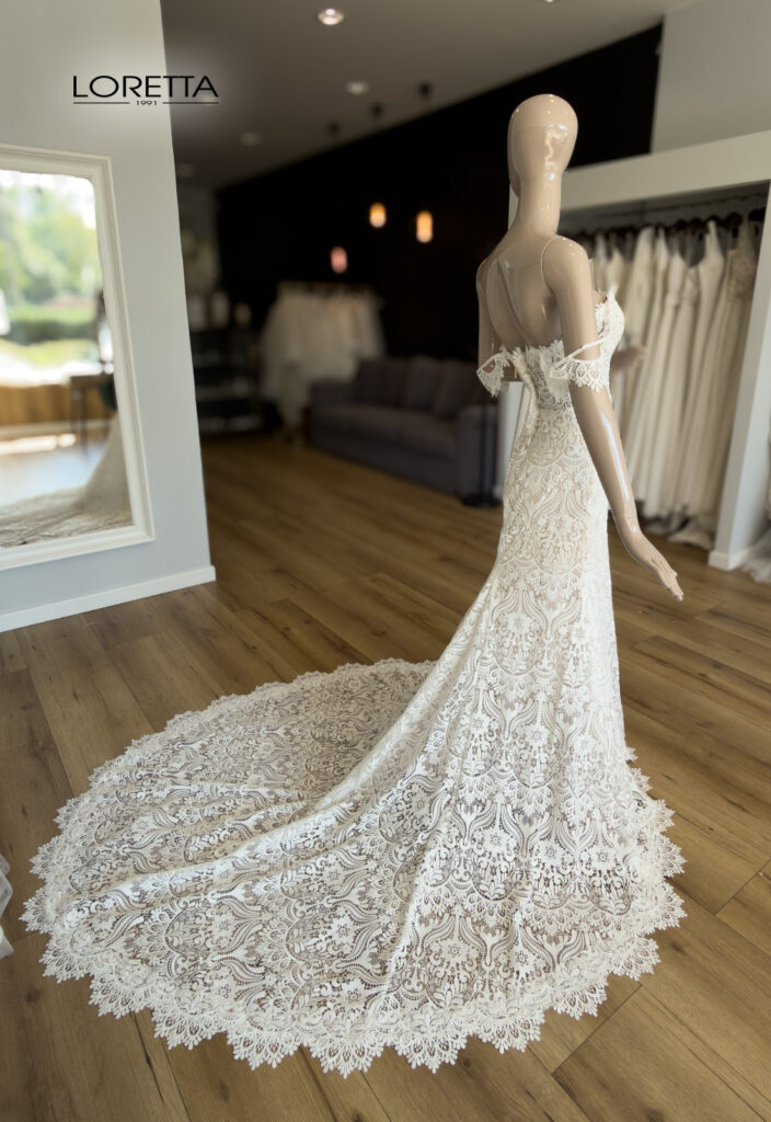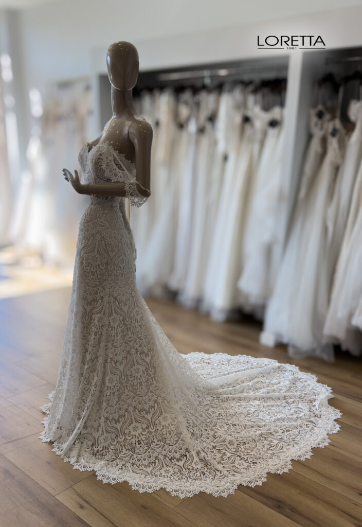 Jej zmysłowa, barokowa koronka idealnie otula kobiecą sylwetkę w odpowiednich miejscach, by następnie spływać od kolan w dół i splatać się w długi, falbaniasty tren.