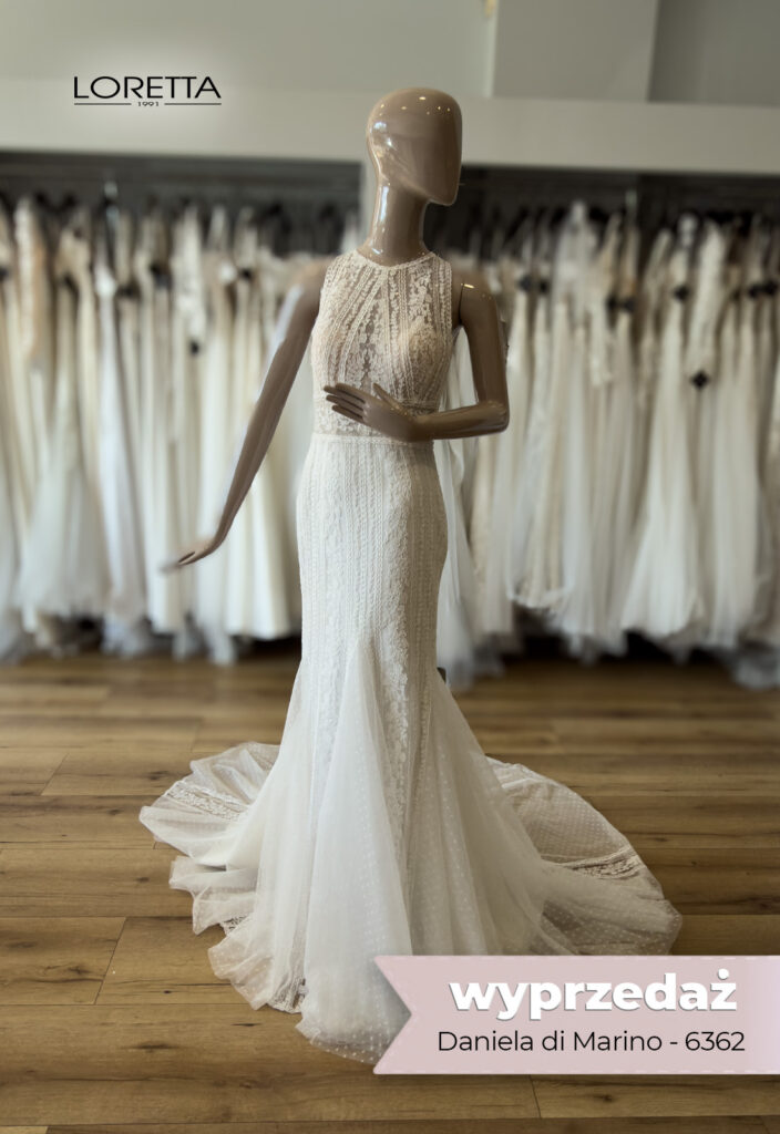 Ta suknia ślubna od Danieli Di Marino to nowoczesna klasyka, idealnie łącząca misterną koronkę z ponadczasową tiulową spódnicą.