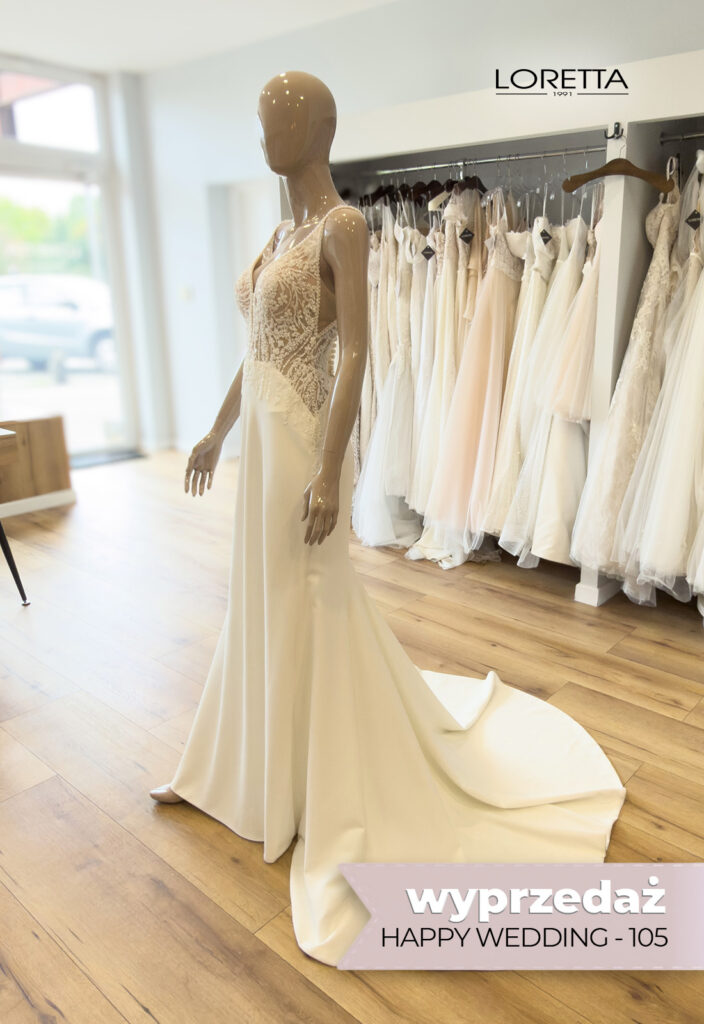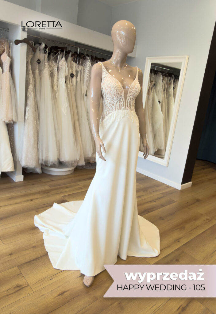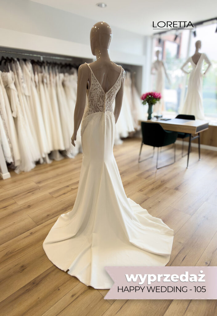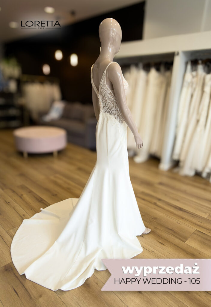 Suknia ślubna Happy Wedding model 105 to kreacja, w której uroda spotyka wygodę — idealny wybór dla panny młodej pragnącej zarówno wyglądać olśniewająco, jak i czuć się swobodnie w całym dniu uroczystości.